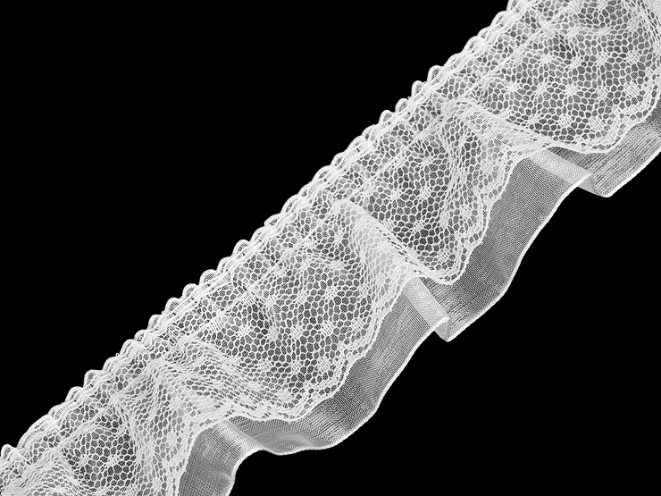 Dvojitý čipkový volánik je trochu nariasený. Volánik využijete na ozdobenie rôznych predmetov, krabíc či textílie.